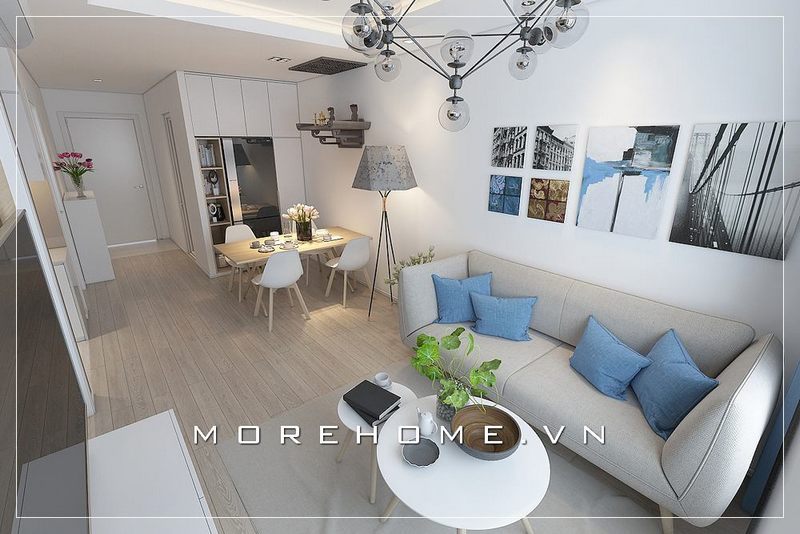 Sự kết hợp giữa cách thiết kế phòng khách hiện đại kết hợp cùng đèn trang trí chùm đã tạo nên sự độc đáo, ấn tượng cho không gian căn hộ.