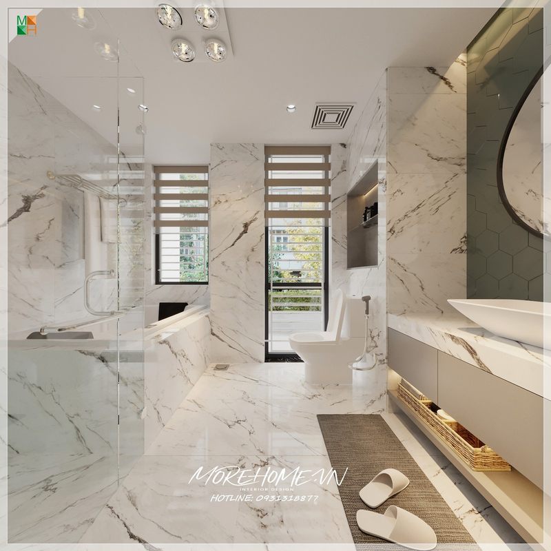 Mẫu phòng tắm được ốp đá nhân tạo cao cấp vân tia sét tông màu trắng lạnh, đón ánh sáng tự nhiên nhờ thiết kế cửa kính giúp không gian phòng tắm được mở rộng và thoáng đãng hơn