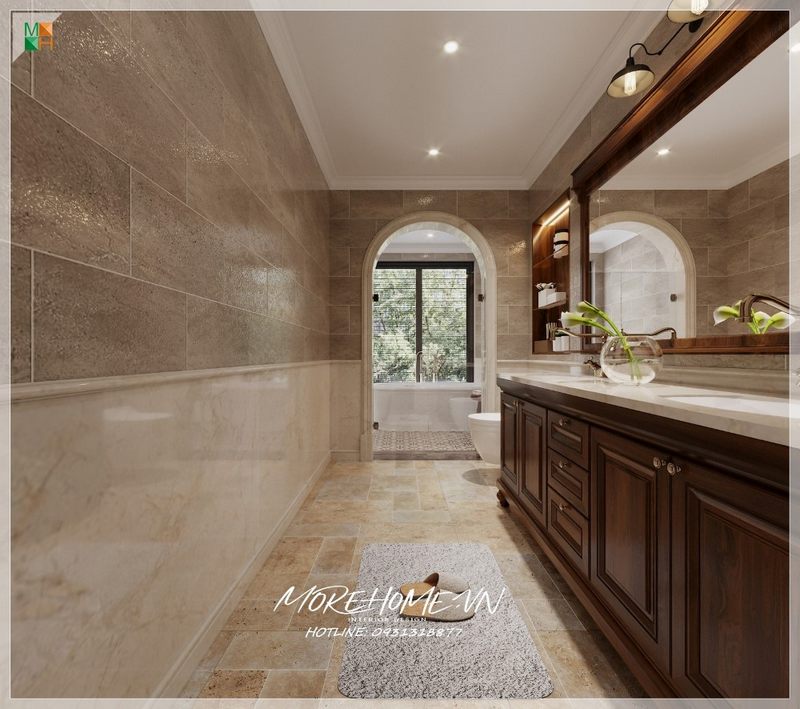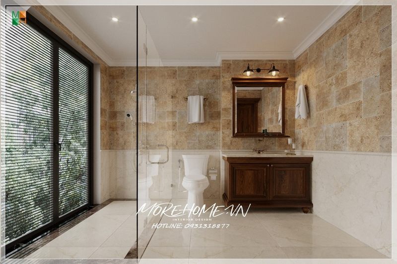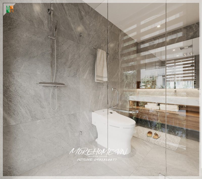 Thiết kế phòng tắm rộng với nội thất đá, kính giúp không gian phòng thoáng và rộng rãi hơn