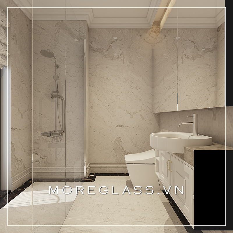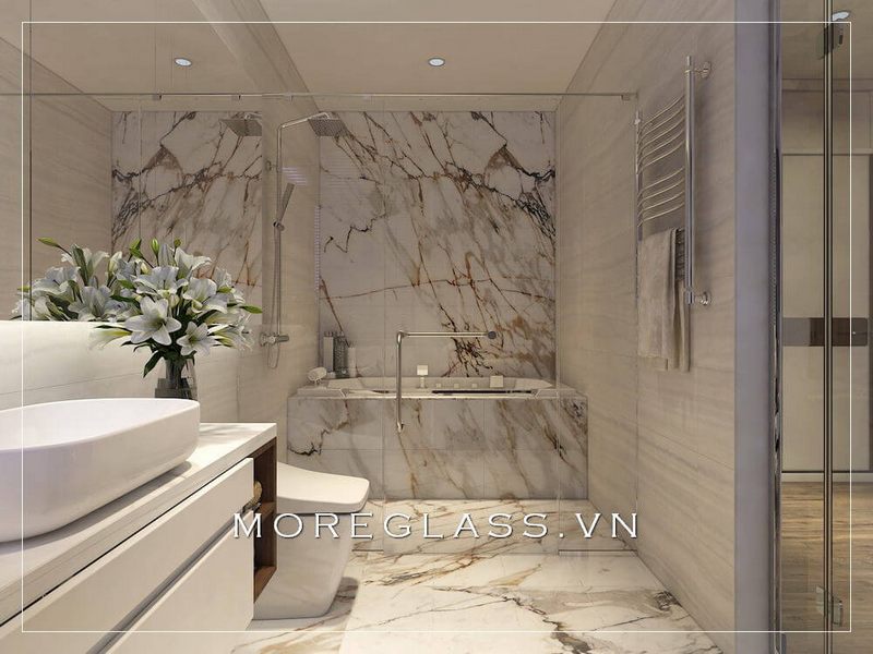 Thiết kế phòng tắm hiện đại với kính cường lực và đá ốp tường màu trắng vân mây tạo sự thoáng mát và sạch sẽ