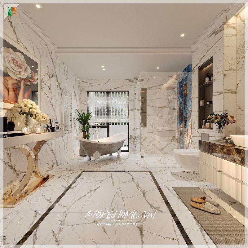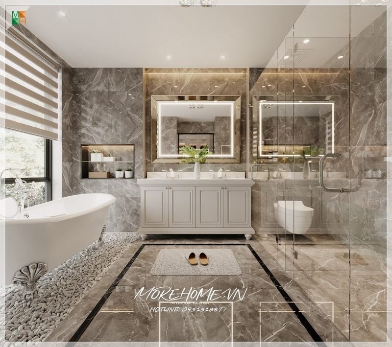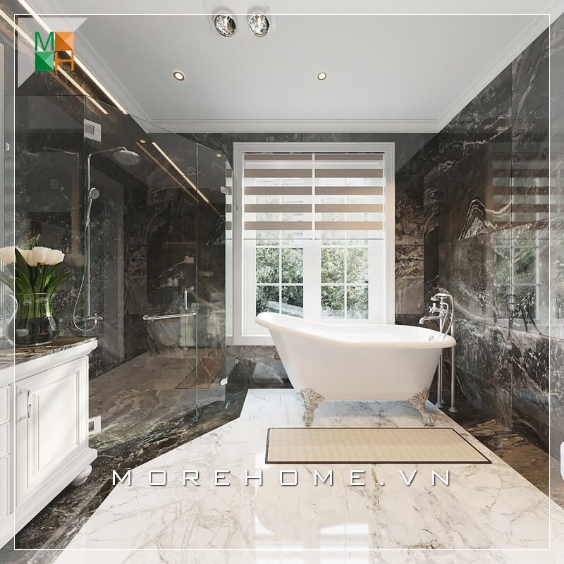 Đá ốp cao cấp được sử dụng trong thiết kế phòng tắm hiện đại của biệt thự, nhà phố với tâm điểm bồn tắm tiện lợi là gợi ý tuyệt vời để nhiều gia chủ lựa chọn.