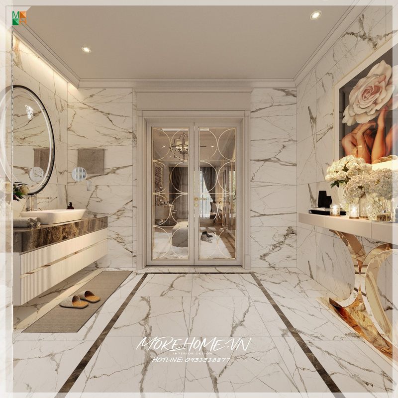 Sư dụng đá ốp tường phòng tắm màu trắng với đường vân loang sang trọng tạo điểm nhấn nổi bật cho không gian phòng tắm biệt thự