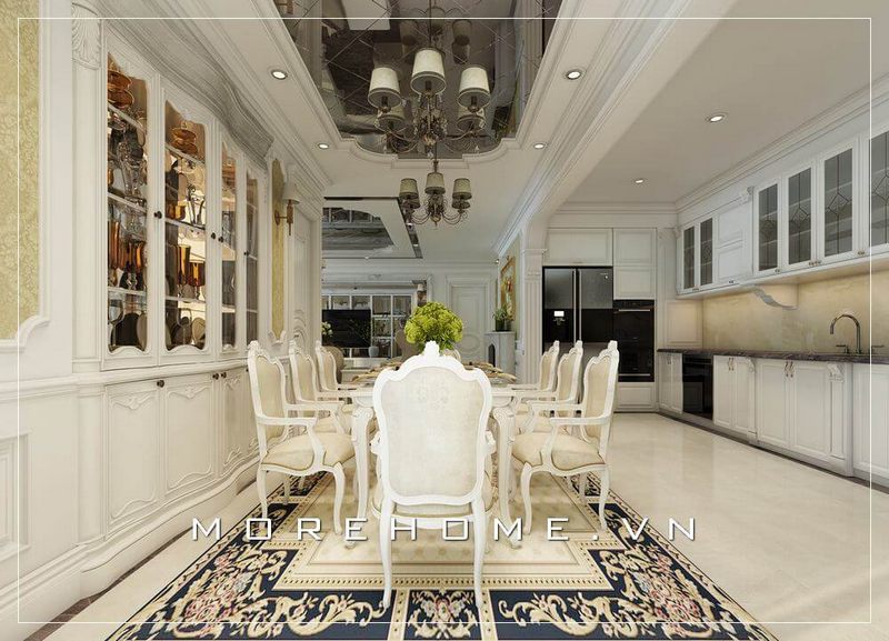 Nội thất phòng ăn tân cổ điển sang trọng với tone màu trắng ấn tượng, đẳng cấp