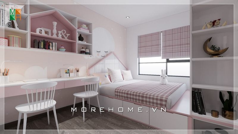 Trang trí nội thất phòng ngủ bé gái xinh xắn, đáng yêu, chiếc bàn học được bố trí trong phòng giúp con có một không gian nghỉ ngơi và học tập thoải mái nhất