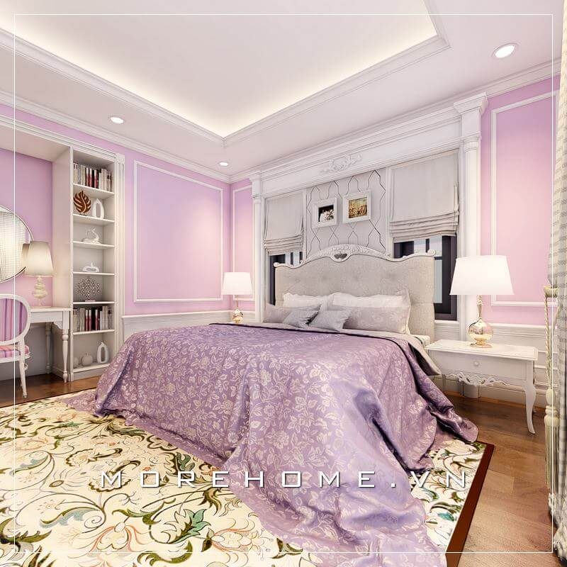 Sự kết hợp hài hòa giữa gam màu trắng - hồng kết hợp với đường nét chạm khắc nhẹ nhàng của phong cách tân cổ điển tạo nên một căn phòng ngủ bé gái đầy trẻ trung và ấn tượng