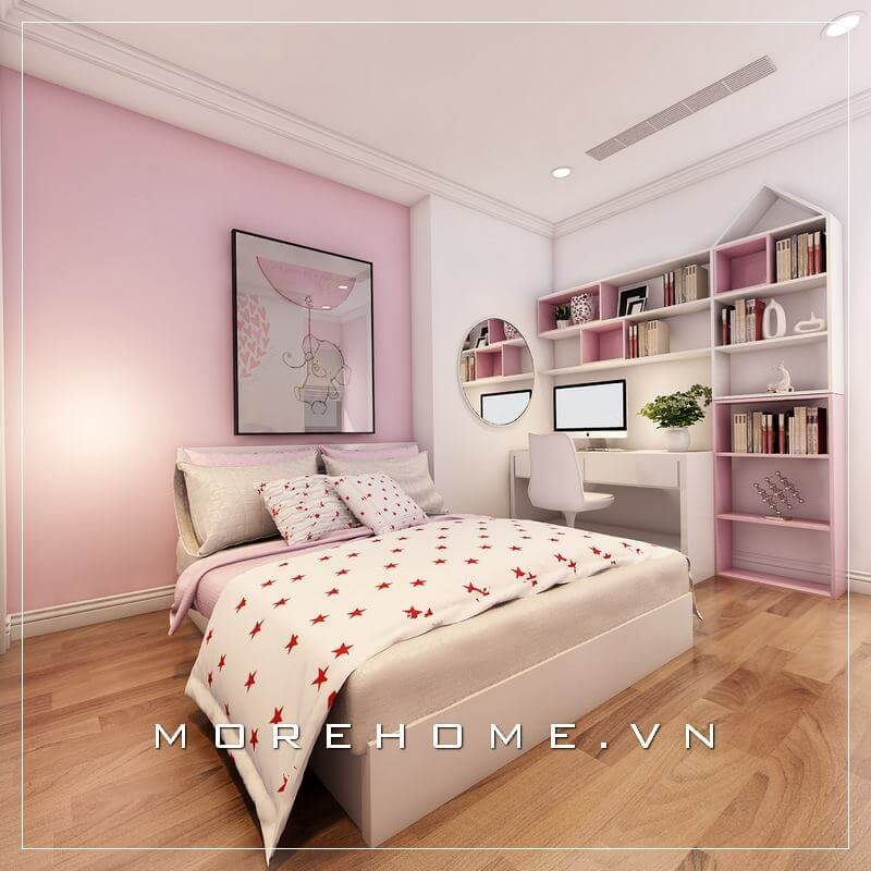 Thiết kế nội thất phòng ngủ bé gái đáng yêu với tường màu hồng nữ tính kết hợp nội thất đơn giản tiện nghi mang đến một căn phòng mơ cho bé