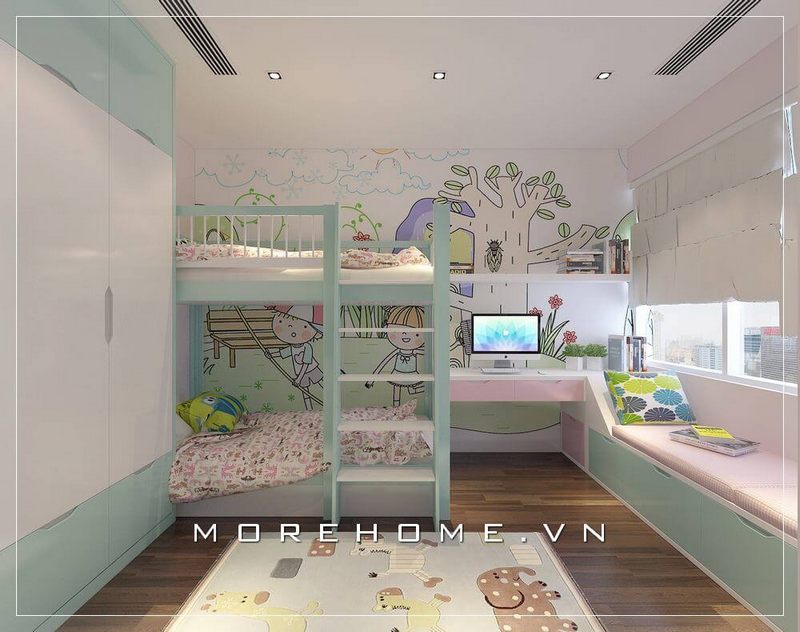Mẫu thiết kế nội thất phòng ngủ 2 bé gái tại chung cư hiện đai