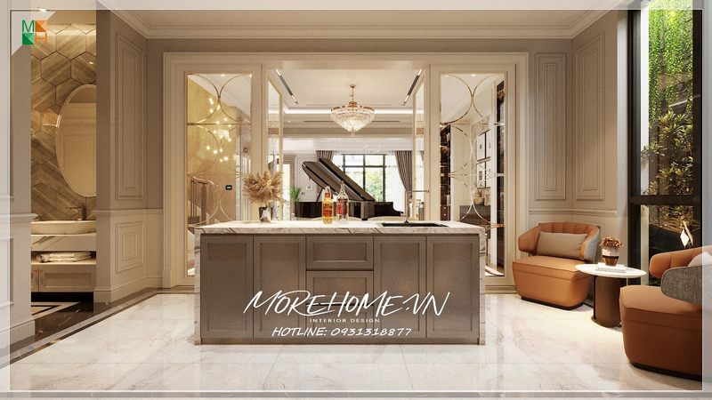 Mẫu thiết kế nội thất liền mạch giữa phòng khách khách sạn liền phòng bếp rất tiện nghi.
