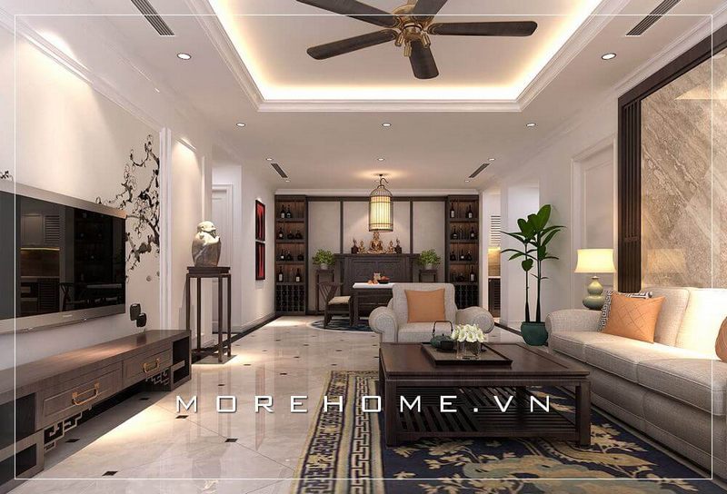 Bài trí bàn thờ phật trong phòng khách căn hộ đương đại hợp phong thủy.