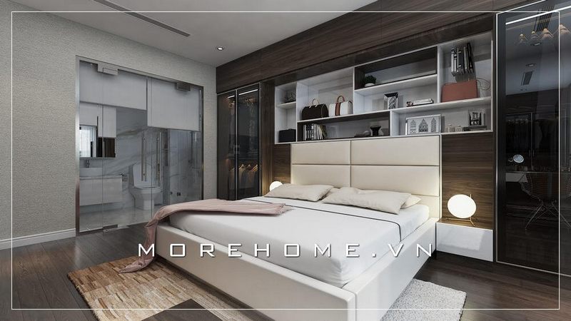 Thiết kế nội thất phòng ngủ gỗ công nghiệp nhẹ nhàng kết hợp tone màu trắng chủ đạo mang lại không gian nghỉ ngơi yên tĩnh mà không kém phần sang trọng