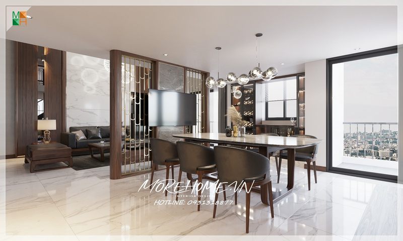 Phòng ăn được trang trí đẹp với bộ bàn ăn dành cho 8 thành viên, đèn thả trần nghệ thuật, gạch lát nền giả đá màu nâu cao cấp và tủ gỗ kết hợp kính có đèn led để hiển thị đồ hiện đại.