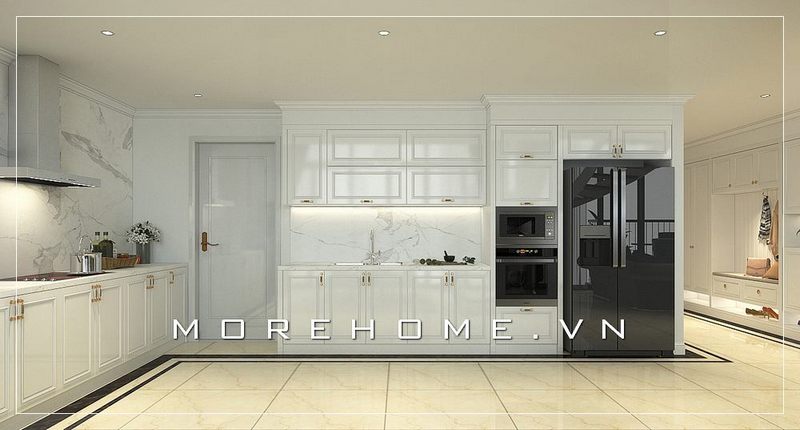 Thiết kế nội thất phòng bếp biệt thự sang trọng với tone màu trắng chủ đạo tạo nên không gian thoáng rộng và đẳng cấp hơn.